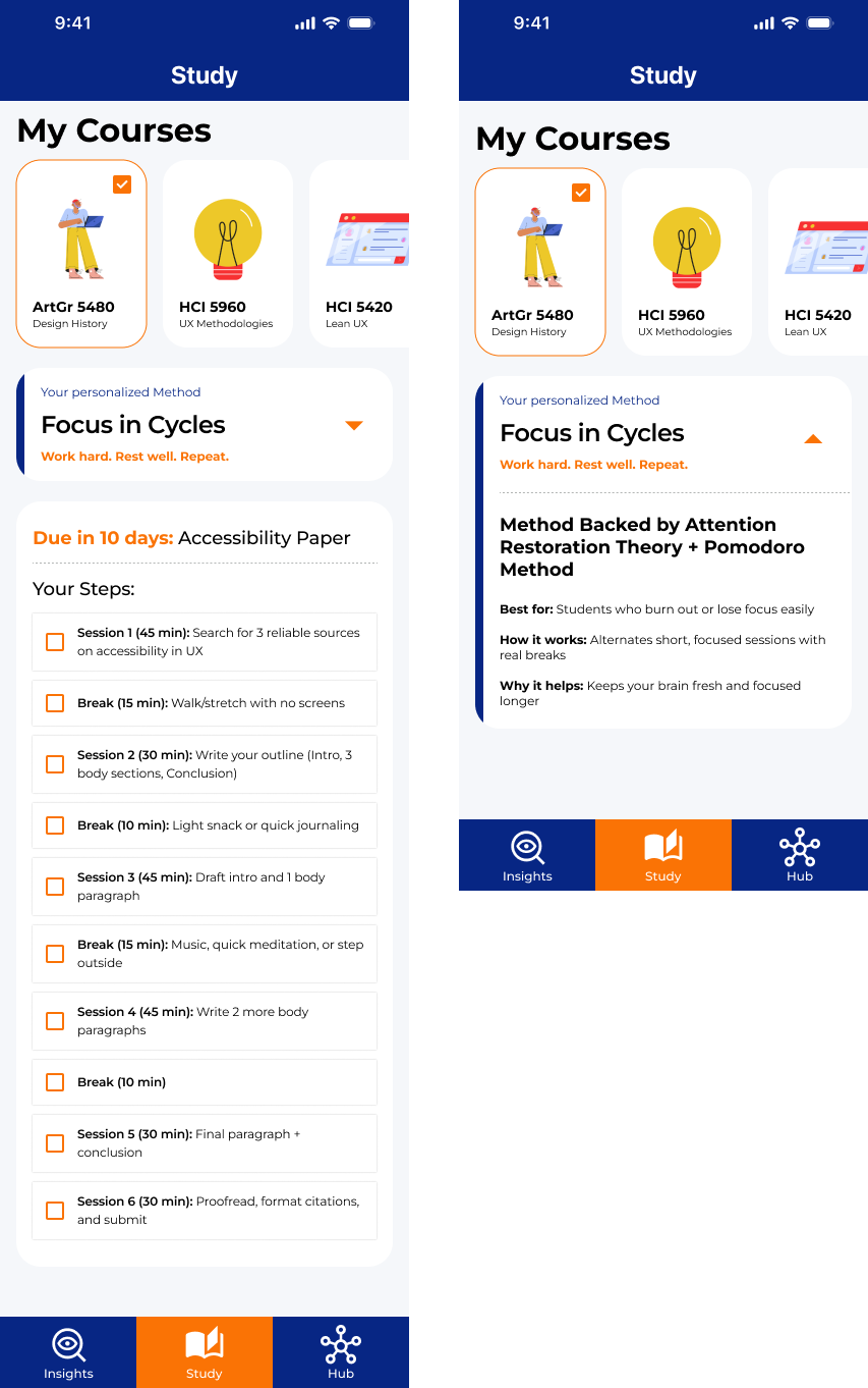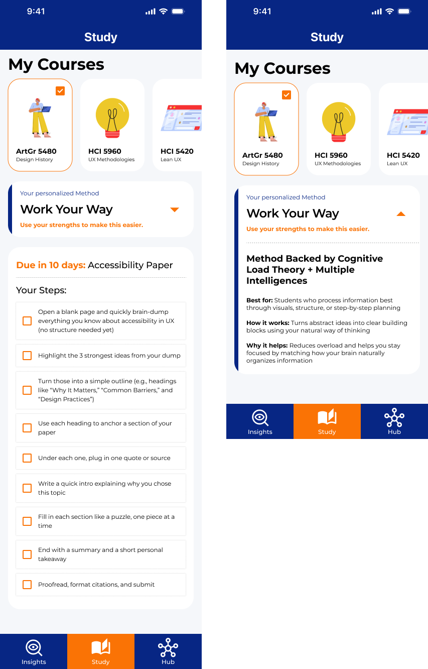 The product needed to feel supportive rather than demanding, helping students regain momentum during periods of low motivation.