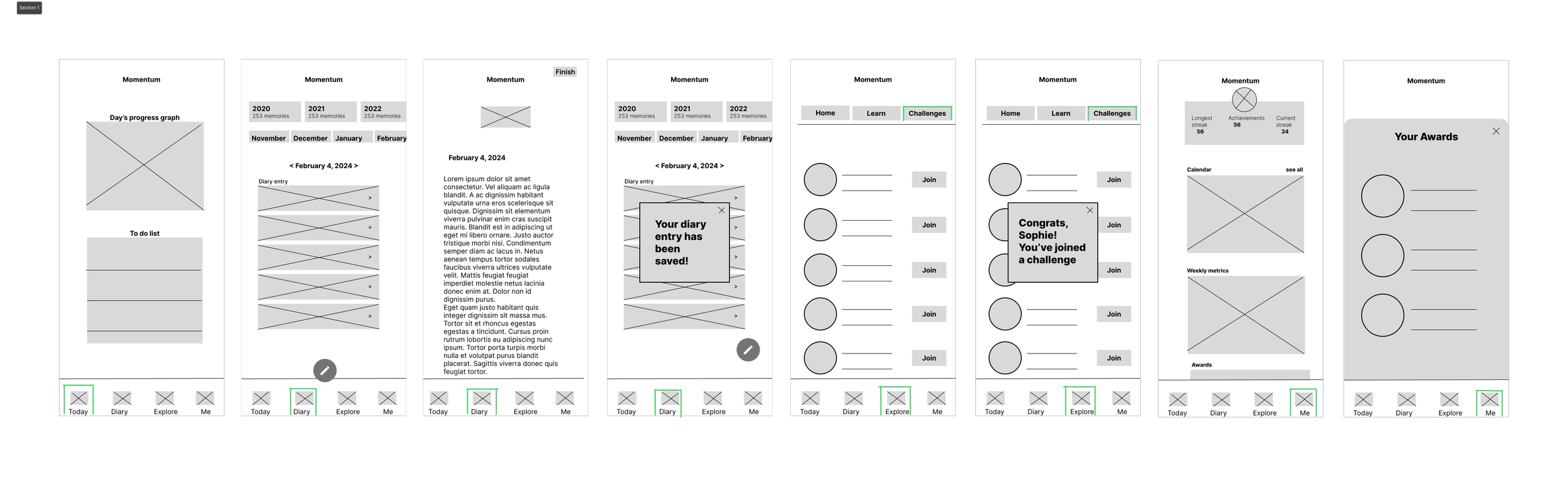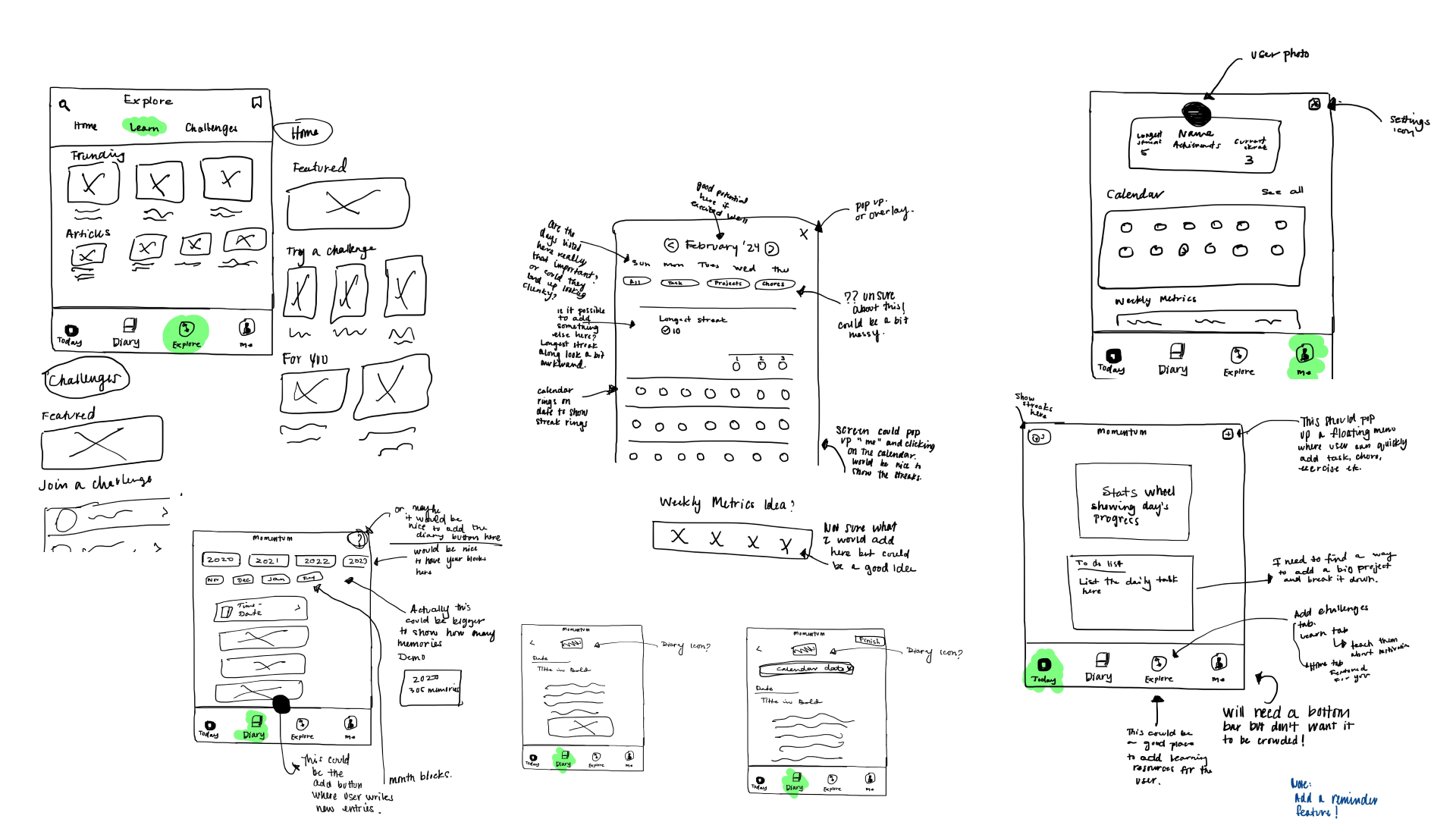 The project followed an iterative design process combining behavioral research with hands-on prototyping. Early design exploration began with paper wireframes that mapped potential user flows and information structures. Initial concepts included journaling features, daily reflection tools, and task management components.