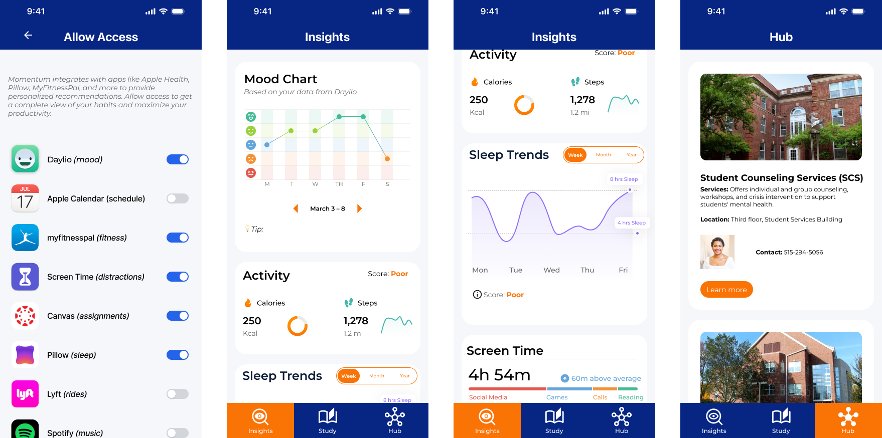 Momentum is a mobile application designed to support student motivation by integrating academic planning with behavioral insights such as sleep patterns, mood trends, and screen time. Instead of relying on reminders or rigid task lists, the system provides personalized strategies based on each student’s current behavior patterns. T